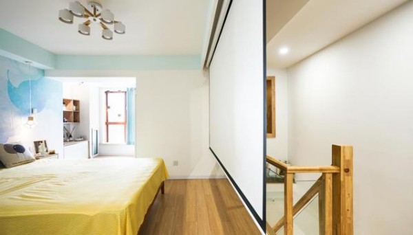 上楼第一眼看到的就是一张很大的双人床,户主是一对夫妻,非常会享受生活,这样布局真的好聪明!直接在床对面安装了100寸的投影仪,在家也能看电影。