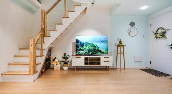左边的楼梯整体采用原木风的设计,给人很温馨的感觉。楼梯下方的空间不浪费,打空做成柜子用来收纳,再好不过。