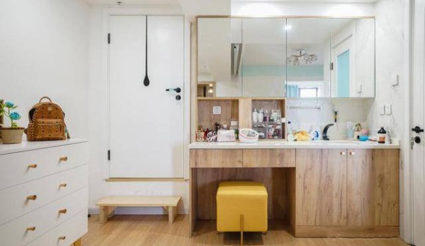 因为女主人非常喜欢化妆,于是直接把手盆外移,安装一个超级大的镜柜来作为收纳