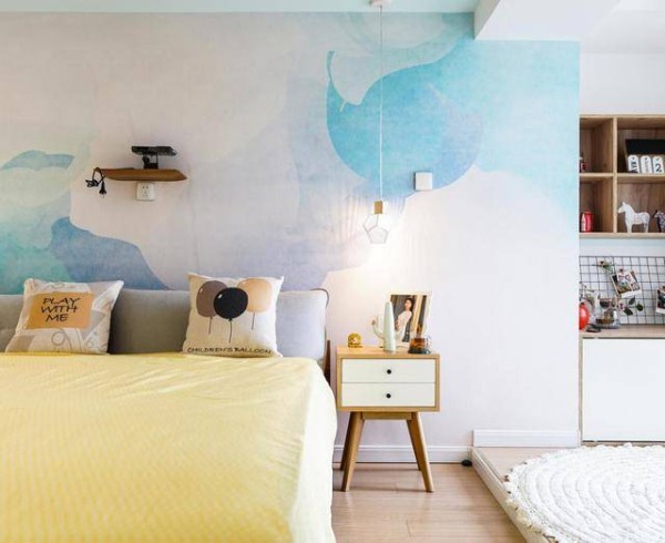 为了不显得单调,床头延伸至床头柜都铺满了水蓝色的壁纸,给人一种丰富的层次感,在双人床的右手边设置了一个小的储物柜,这是用来干什么的呢?