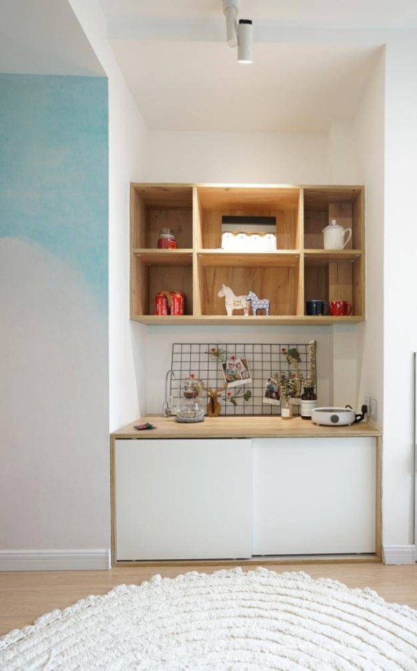 原来,里面是一个小小的生活功能区,内部有直饮水的过滤器,想喝水的话就不用跑到楼下去,下面铺了一张白色的地毯,平时就可以坐在地上看看窗外的风景,好惬意。
