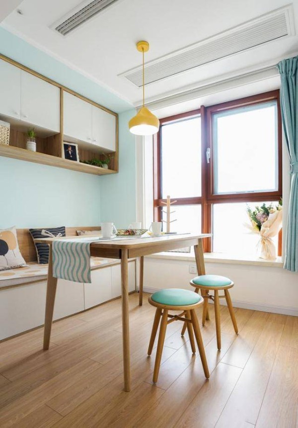 由于是小户型,面积不够大,餐厅可以设计成卡座的形式,能节省很多的空间,刚好飘窗和卡座可以练成一体,吊柜的安装和卡座的设计,让收纳能力又上升一个等级。