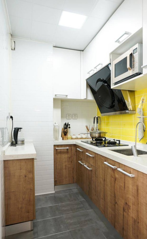 没有窗户的暗厨,机智地采用了白色的面包砖来增加亮度,另一面墙用明亮的黄色来强调厨房的重心,厨房格局有些奇葩,但功能是非常的齐全。