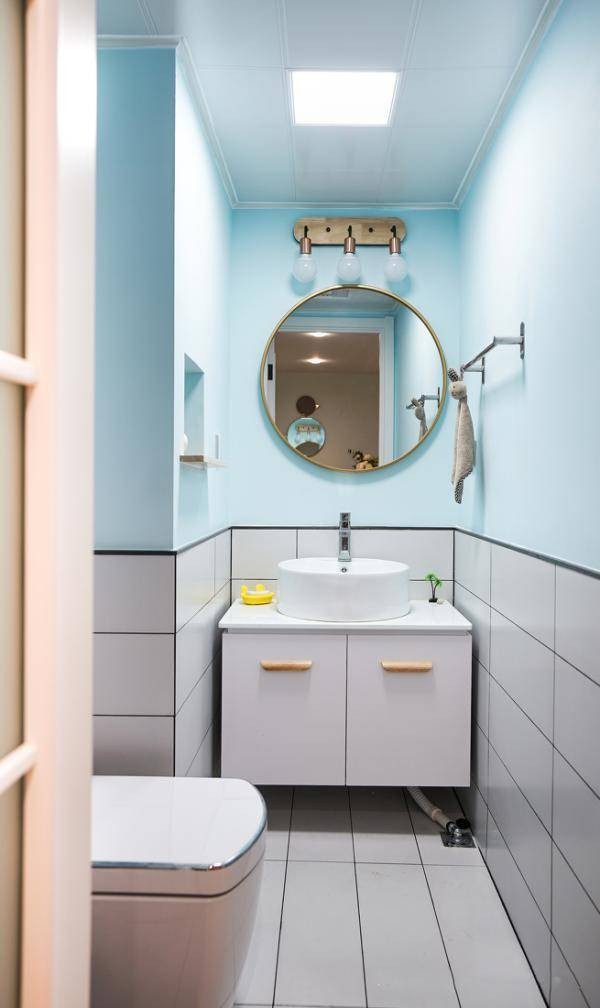卫生间和厨房一样,同样的没有窗户,也是用同样的手法,采用明亮颜色来提升整个空间的质感。而且对于干区卫生间,乳胶漆+瓷砖的搭配,完全能满足需求,还能节省一部分的瓷砖预算。