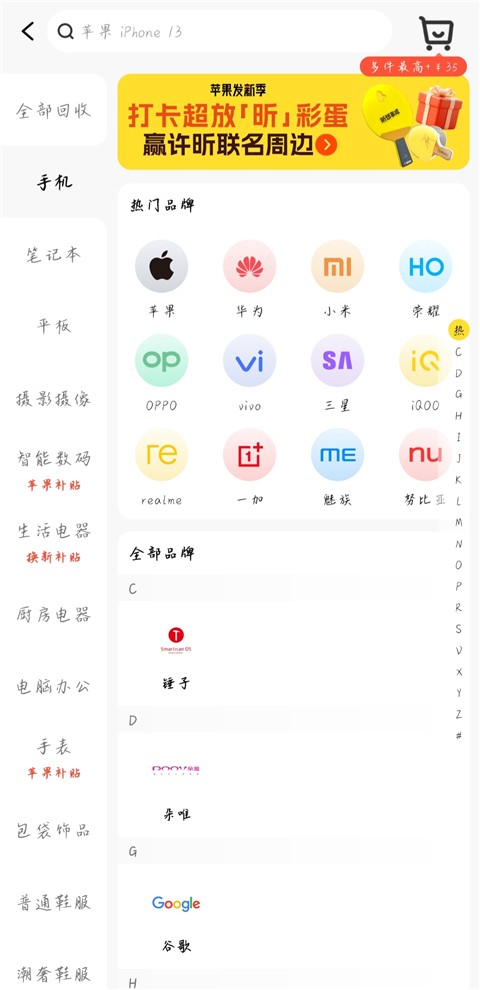 回收品类覆盖手机数码、奢侈品、金银珠宝、名酒、潮鞋卡券等