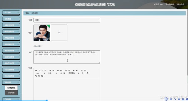 研究背景随着高校规模的不断扩大和学生生活水平的提高,校园内物品更新换代速度加快,大量闲置物品随之产生。这些物品中不乏仍具使用价值的学习资料、生活用品乃至电子产品,但由于缺乏有效的回收与再利用机制,往往被随意丢弃或闲置,不仅造成了资源浪费,也加剧了环境负担。同时,学生之间对于二手物品的需求日益增加,却常因信息不对称而难以高效匹配。因此,构建一个校园闲置物品回收系统显得尤为迫切,旨在通过数字化手段促进资源循环利用,增强环保意识,丰富校园文化生活。
