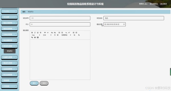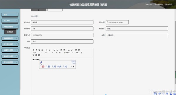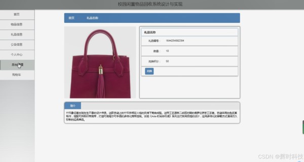 研究内容本研究内容主要围绕校园闲置物品回收系统的功能设计与实现展开,具体包括以下几个方面:首先,设计学生用户模块,实现用户注册、登录、个人信息管理等功能,确保系统用户的安全性与隐私保护;其次,构建物品分类与信息管理模块,支持学生根据物品类型(如书籍、衣物、电子产品等)进行分类发布,并提供详细的物品描述、图片上传等功能,以便其他用户快速了解并搜索所需物品;再者,开发失物招领与物品捐赠模块,允许学生发布失物信息或捐赠意愿,促进物品的快速找回与再利用;此外,引入积分管理系统,根据学生参与回收、捐赠等活动的贡献值,自动增加或扣减积分,并设置积分兑换区,提供多种礼品供学生选择,以激发其参与热情;最后,优化系统界面与交互设计,确保用户体验流畅,提升系统整体满意度。