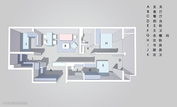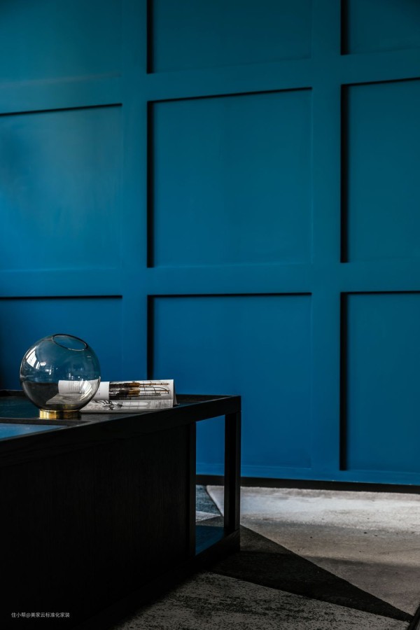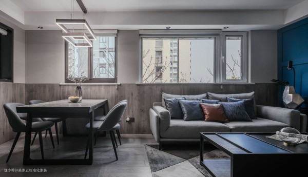 客厅与餐厅的连接让家人之间得以拥有更多、更舒适的互动及活动空间。干净利落的空间设计,摒弃了繁冗,留给我们更多思考的空间;低调的灰色系沉稳、大气,在快节奏的喧嚣生活中,让人静下心来,享受家中安静的美好。跳跃的蓝色系让的平静生活中带着一丝激情。