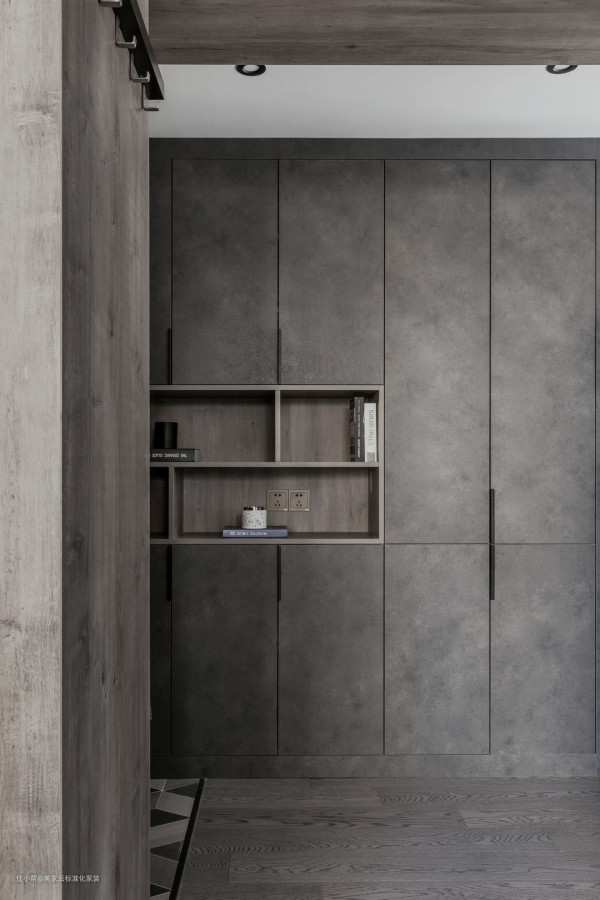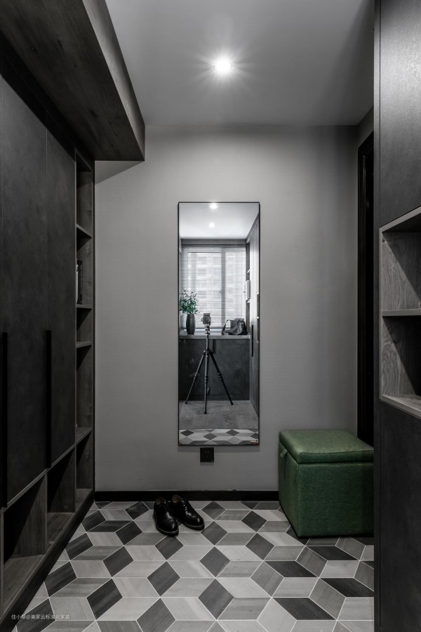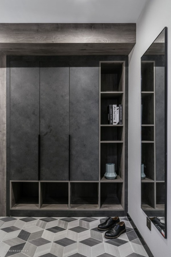 步入门厅半封闭鞋柜,满足正常储物空间的同时没有繁杂的装饰和色彩,纯净大方而又气定神闲,黑色中透出霸气与安全。右侧的全身镜让人出门之前可以整理自己的着装仪容,元气满满的迎接崭新的一天。
