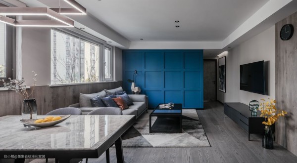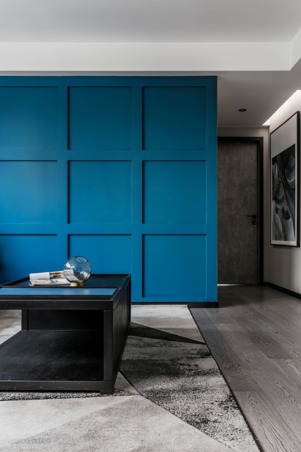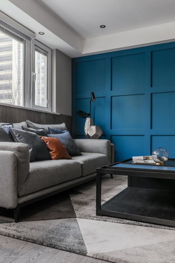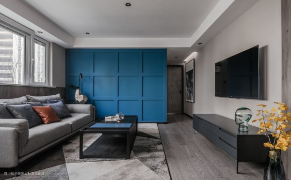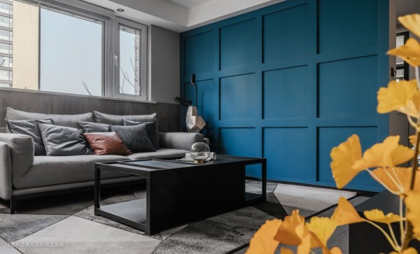 客厅呈黑白灰色调,作为整个客厅的亮点——沙发背景墙,设计师用特殊材料做呈现,还原并强调空间内材质交织的魅力。采用不一样的蓝色石膏板造型,平衡着整个空间内的家具造型,同时也平衡着理性的生活方式,满足感性、大胆、创新的生活体验。电视背景墙与木纹形成了独有的成熟内敛气质。
