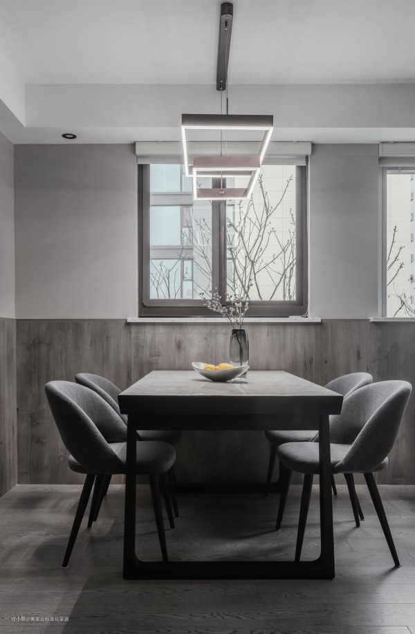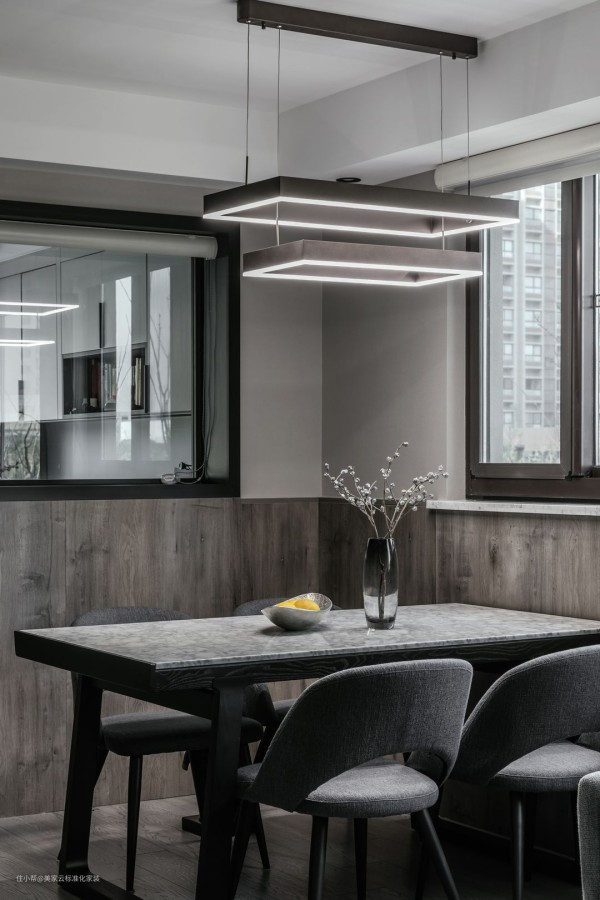 设计师运用开阔的空间设计手法,将餐区、客厅相连,扩大视觉感受,设计出满足个性化生活需求的流畅动线。灰色系与木饰贯穿空间,灯具由几何线条塑造造型,玫瑰金色外观增加美观度。