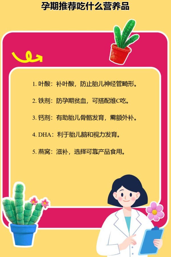 孕期可选择的营养品有叶酸、铁剂、钙剂、DHA、燕窝等。