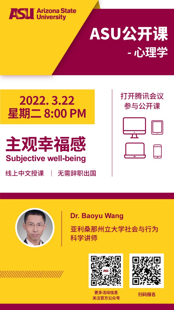 亚利桑那州立大学心理学公开课 2022年3月22日(周二)北京时间晚8:00,由ASU跨学科文理新学院社会与行为科学学院讲师王宝玉教授主讲,主题为《积极心理学与幸福感》的在线讲座,将通过腾讯会议平台开展。
