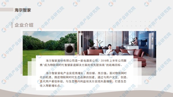 海尔智家股份有限公司是一家电器类公司。2018年上半年公司聚焦"成为物联网时代智慧家庭解决方案的领先提供商"的战略目标。海尔智家家电产业实现高增长、高份额、高价值;面对物联网时代的机遇,推进物联网时代生态品牌的创建,通过与用户交互,创造、迭代用户最佳体验,与生态圈内利益攸关方实现共赢增值,打造生态收入等新增长点。