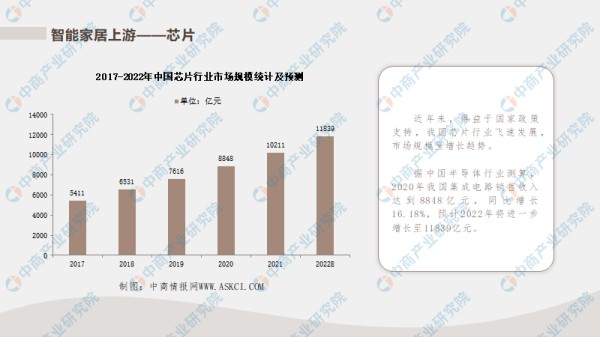 近年来,得益于国家政策支持,我国芯片行业飞速发展,市场规模呈增长趋势.据中国半导体行业测算,2020年我国集成电路销售收入达到8848亿元,同比增长16.18%,预计2022年将进一步增长至11839亿元。