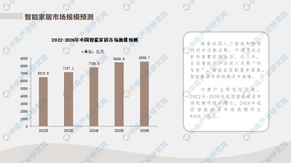 随着我国人工智能和物联网技术逐渐成熟,中国开启全新的智慧家庭生活。近几年,各类智能化产品进入发展“快车道”,智能家居配置率提高,智能家居市场规模逐年递增。中商产业研究院预测,2022年-2026年我国智能家居市场规模将稳步增长,2026年我国智能家居市场规模将达8556.7亿元。
