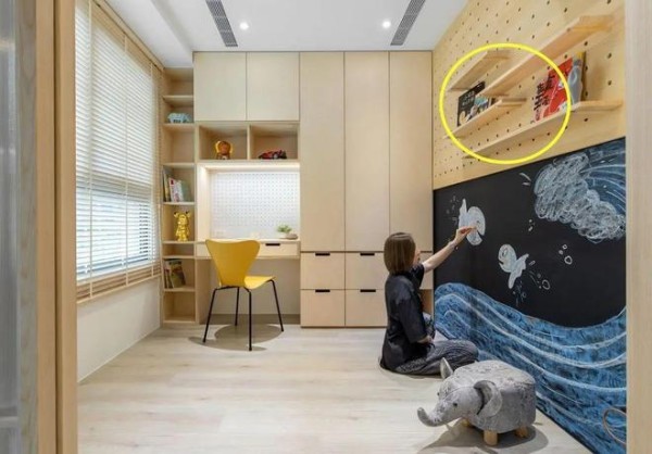 有孩子的家庭,完全可以参考这个设计,利用书房空间的一面墙就能搞定。去除原始的大白墙,转而用更加实用的布局代替。具体装修也非常简单,一半洞洞板+一半黑板墙设计,2个不同的材料拼接在一起。