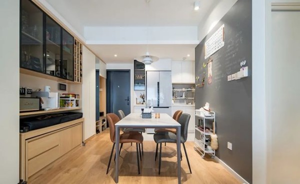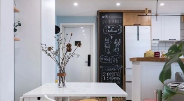 卫生间处也能采用。给门洞外部两侧装上黑板墙装饰,每天都可以涂鸦不同的作品,装饰了整个空间,还能起到和玻璃一样的防水效果,不妨试一试哦~