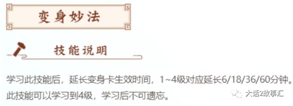 变身妙法的技能可以延长变身卡的生效时间,点满4级后能延长变身卡1个小时的使用时间,升到4级的话,总共的消耗大概是60亿的经验和9000万的师门贡献。这个开销小编认为是非常值得的。
