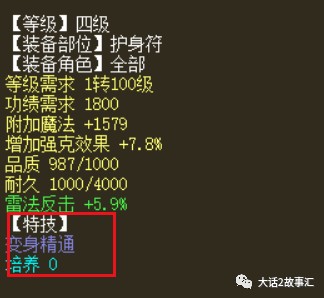 第二个延长变身卡时间的方法就是佩戴特技变身精通的护身符。玩家并不用担心影响自己主力护身符的使用,只需要变身前佩戴上带有特技的护身符,变身完,时间增加了,再换成主力护身符即可。特技变身精通能提升2个小时的变身时间。