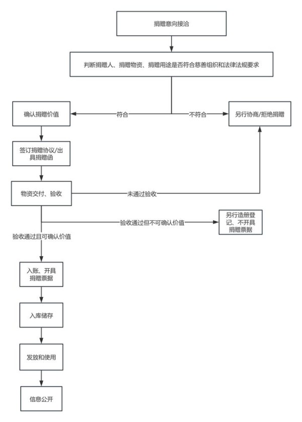 接受捐赠时,慈善组织依据《民间非营利组织会计制度》的计价原则确认捐赠物资价值,并与捐赠人就物资捐赠签订书面协议,写明捐赠物资的名称、类型、数量、质量状况、价值、交付、捐赠用途、捐赠日期等信息。慈善组织与捐赠人提前约定捐赠物资的交付方式、地点、时间以及运输费用的承担方,捐赠物资的风险自捐赠人交付给慈善组织时起由慈善组织承担。