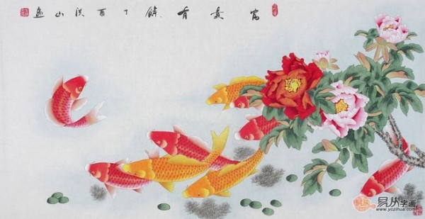 画面上,九条鲤鱼在水中游刃自如,或追逐打闹,或回眸观望,或并排前行,鱼儿潜游,顿觉舒心美好,更何况旁边还有牡丹花盛开,妩媚多姿,情景动人。九条鲤鱼在水里游来游去,还有“如鱼得水”的意义,寓意工作和生活长久如意,而牡丹又象征着富贵,这样的画作,赏心悦目,内容寓意美好,积极向上,尺寸不大不小,非常适合挂在卧室。