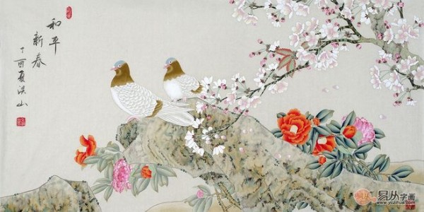 鸽子是和平的使者,象征着幸福、纯洁,西方文化把鸽子视为和平、爱情、平等的象征,中国文化则把鸽子视为信义和家庭和睦的标志。两只热爱和平的鸽子在岩石上相伴而立,红粉牡丹悄然绽放,满树桃花,花瓣翩飞,落款《和平新春》,表达了作者对和谐、美满生活的向往与追求。