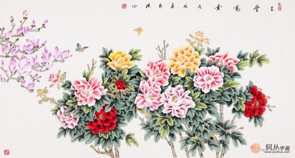 张洪山六尺横幅牡丹玉兰图《玉堂富贵》(作品来源:易从网)