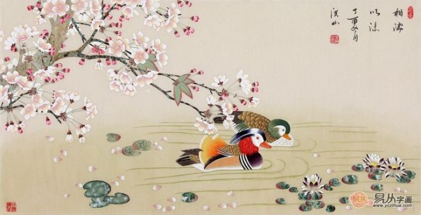 “愿做鸳鸯不羡仙。”满树桃花怒放,花瓣随风飘落,水中莲花盛开,一对鸳鸯戏水,波纹微微向后划行着,样子可爱,姿态优雅恩爱有加,这幅充满诗情画意的画挂在卧室,那真是美妙绝伦啊,如果是夫妻双方的卧室,还可以寓意夫妻和睦,幸福生活呢。