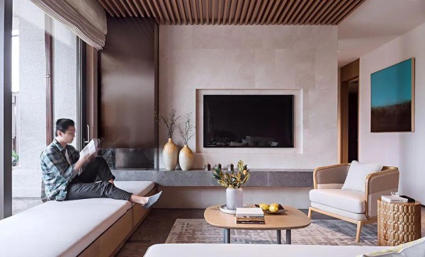 电视墙以定制安装的悬空电视柜,电视柜上布置两个陶艺花瓶装饰,再以壁挂电视机的电视墙造型设计,带来一个极简自然的舒适空间感。客厅靠窗位置的则是定制了一排飘窗充当座椅,垫上布艺垫子,提供了一个轻松舒适的坐席位置。
