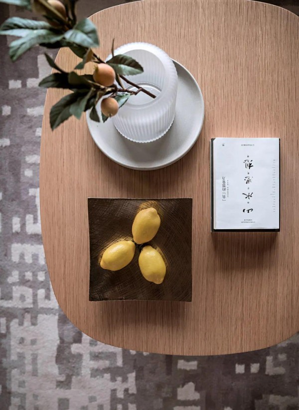 茶几上放着果盘,花瓶与典籍,也为客厅空间增添了几分简约优雅的气息。