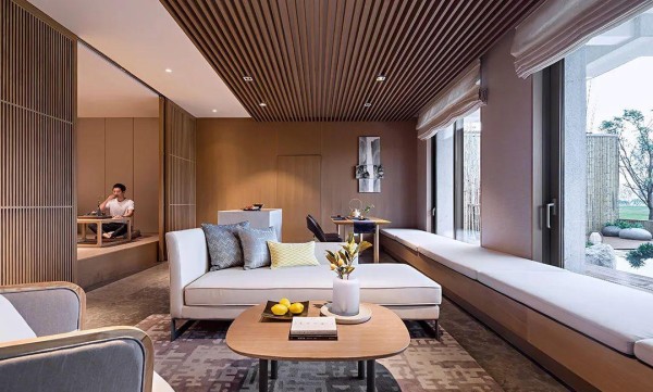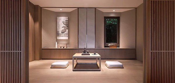茶室整个空间装上定制的地台,中间布置一张茶台+坐垫组合,为主人营造出一个禅意端庄的品茶聊天空间。而茶室外则是以屏风推拉门的设计,使得空间设计更加有趣。