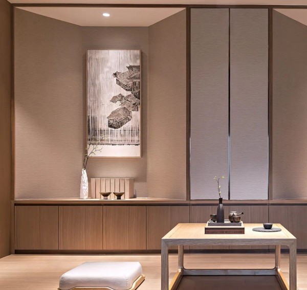茶室侧边墙面做了一排台面,摆上花瓶装饰品,使得茶室空间更加有意韵的气息感。
