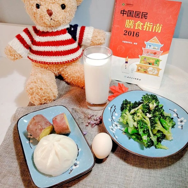 牛奶1杯+菜包1个+紫薯1个+白煮蛋1个+西兰花