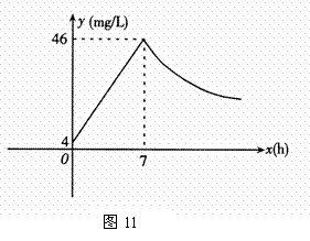 21.(8分)近年来,我国煤矿安全事故频频发生,其中危害最大的是瓦斯,其主要成分是CO.在一次矿难事件的调查中发现:从零时起,井内空气中CO的浓度达到4 mg/L,此后浓度呈直线型增加,在第7小时达到最高值46 mg/L,发生爆炸;爆炸后,空气中的CO浓度成反比例下降.如图11,根据题中相关信息回答下列问题: