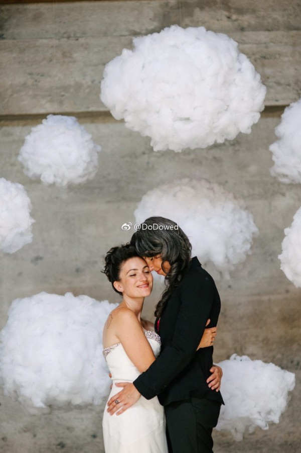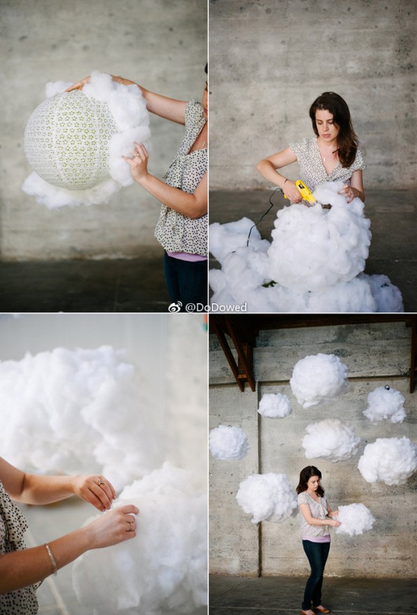 DIY超现实云朵婚礼背景。这几乎不需要任何艺术技巧,只需时间、纸灯笼、填充棉花和胶枪,任何人都可以做到
