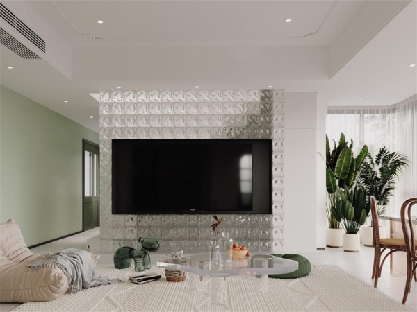 155㎡现代·色彩与光影呈现温暖舒适家 本案为现代风格,以白、浅绿、粉色等柔和色调为基底,融合玻璃砖、复古家具等多元元素,整体营造出兼具活力与舒适的现代居住氛围。