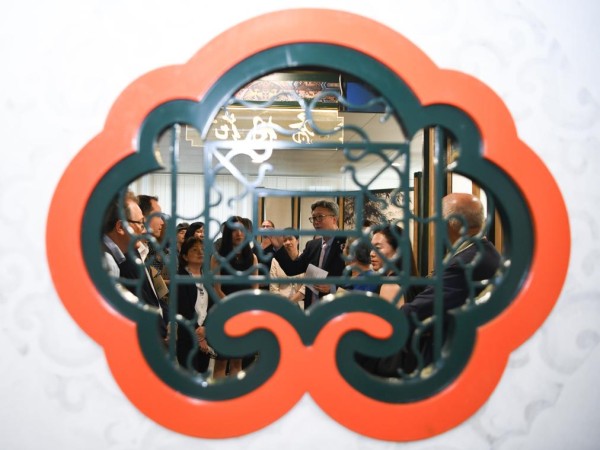 8月22日,在瑞士伯尔尼中国文化中心,嘉宾在 “安善萃锦——中式生活美学展”上拍摄精美饰品。