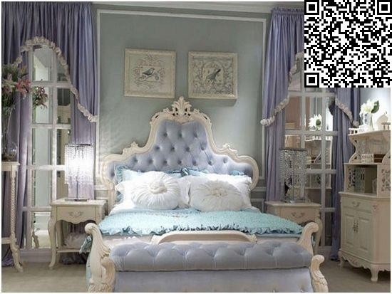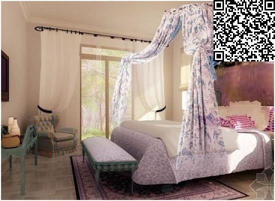 首先我们来看一下白色的窗帘,窗帘选为白色,材质为纱,给人飘渺感;帷幔的是选用的浅紫色,有一种欲抱琵琶还遮面之意。而背景墙是选择的一种紫色中带有粉色的味道,为卧室平添了一种小女人的气质。