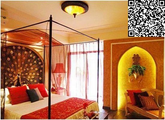 在婚房的搭配中,不能缺少的颜色自然是红色,首先红色在我们中国寓意以后生活红红火火的美好愿望,其次红色可以渲染空间的热闹气氛。适宜色彩配上“半遮面”的帷幔,给人浪漫的感觉,而在卧室背景墙运用的是“孔雀开屏”的一幅图画,时尚而个性。