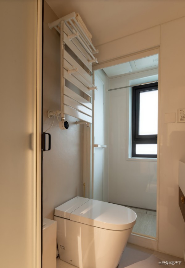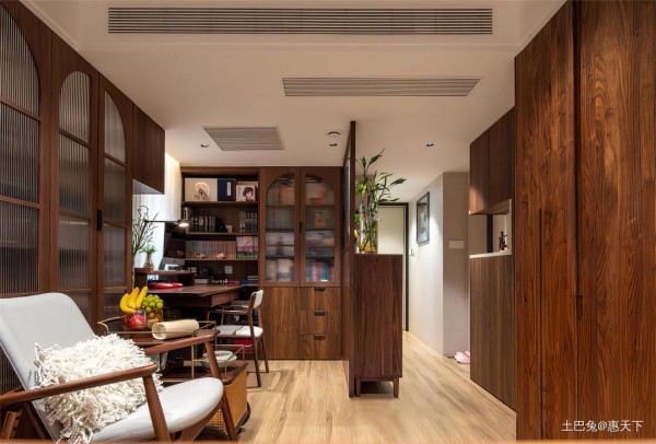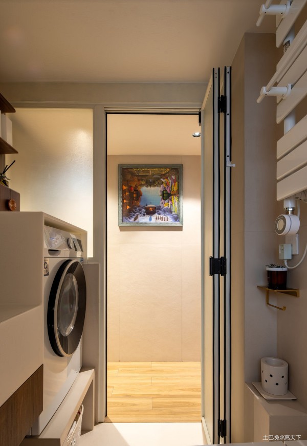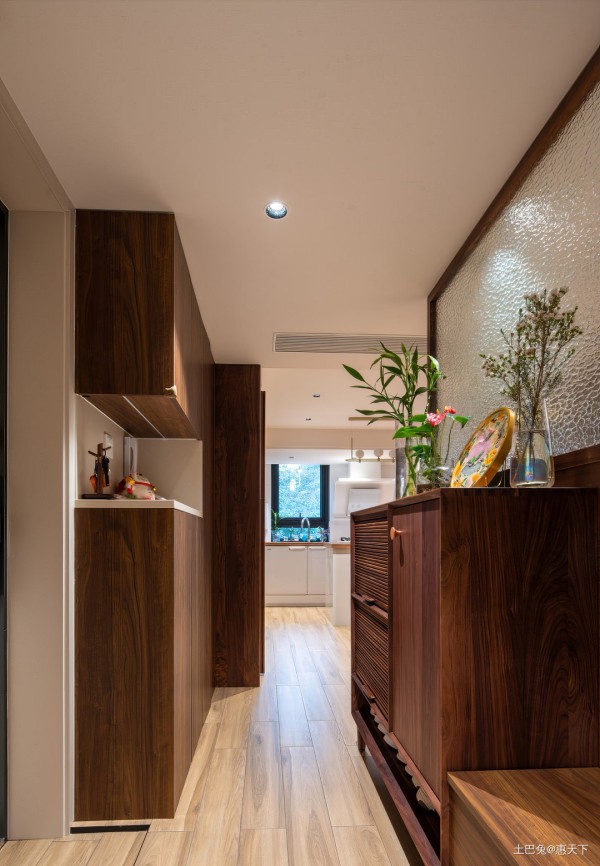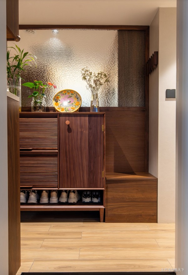 门口正对面做了一个换鞋凳,高度45公分。这样坐着换鞋会更舒服。