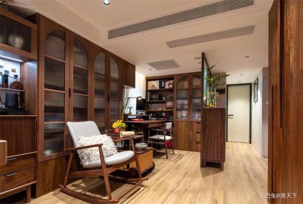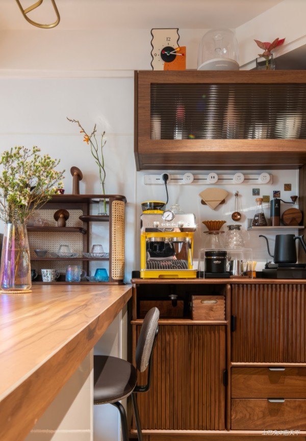 整屋的风格是复古风,胡桃木色的整体橱柜。每一帧都像电影里走出来的场景~氛围感满满~