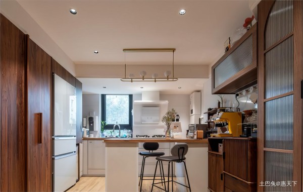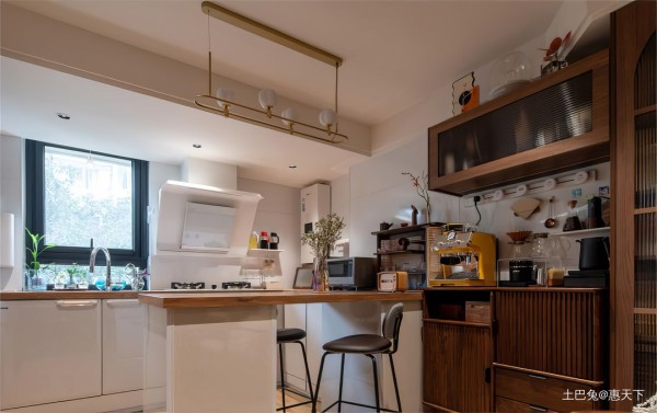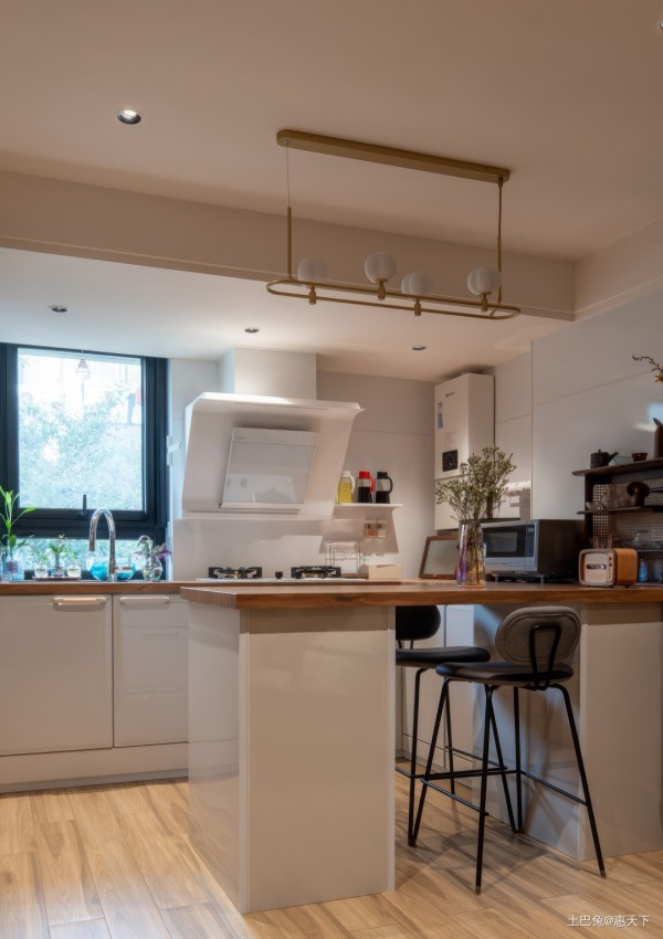 不仅加大了厨房台面的空间,也拓宽了整个客厅的视觉效果。