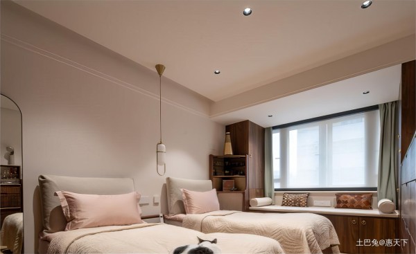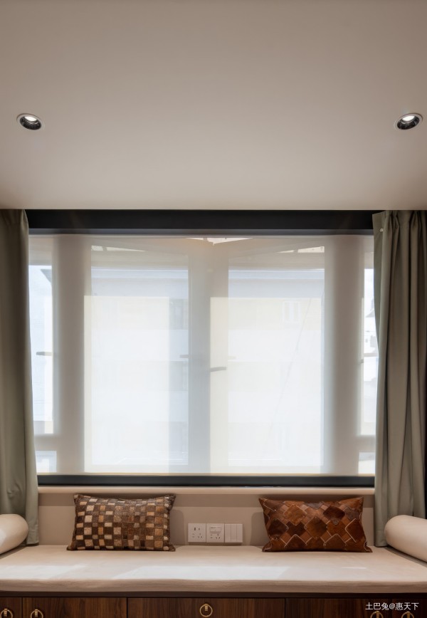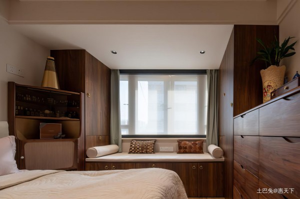 卧室靠墙的飘窗改造成休息场所,在这聊聊天、喝喝下午茶都是很不错的选择。