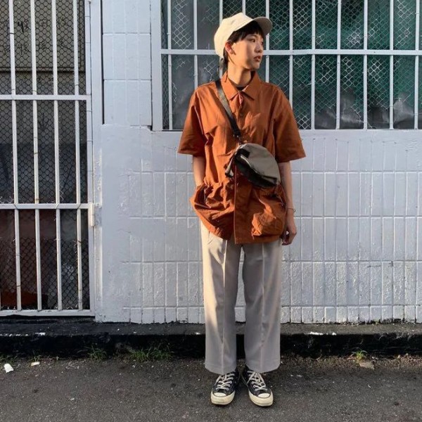 西装裤配衬杉就是完美的结合,而有大地色稍微硬挺的材质,穿上就增添一点帅气感,这样混和能有男孩气息更具特色。