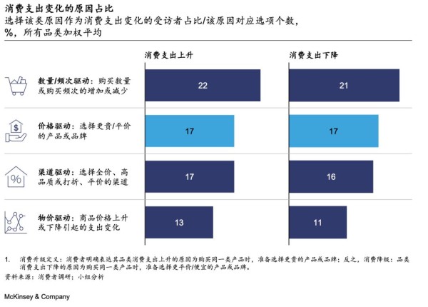在旅行品类上,预期消费增长的消费者更多由数量或频次驱动,而非价格;而支出减少的消费者中,消费降级明显。
