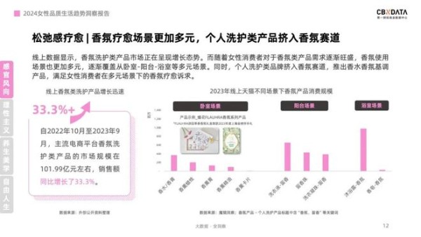 香氛疗愈成为女性放松身心的热门选择。调查显示,半数女性通过香氛气味来舒缓压力,其中高线城市女性对此需求尤为显著。自2022年10月至2023年9月,主流电商平台香氛洗护类产品市场规模达101.99亿元,同比增长33.3%。香氛使用场景也扩展至卧室、阳台、浴室等多元空间,满足女性在不同场景下的疗愈需求。