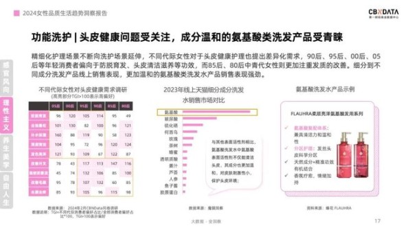 精细化护理的场景不仅局限于护肤领域,还延伸到了洗护领域。头皮健康护理逐渐受到消费者的关注,防脱育发、头皮清洁滋养、发质改善等功效需求成为女性消费者的关注焦点。主打温和洗护的氨基酸类洗发水产品在市场上表现抢眼,它们能够更好地平衡清洁力和温和性,满足消费者对头皮和发丝的科学分区护理需求。