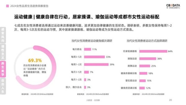 除了营养保健产品,运动健身也成为了女性改善健康状况的重要途径。近七成女性表示会通过运动来增强体魄、纾解压力。在家视频跟练、瑜伽、舞蹈等多种形式的运动方式受到女性的青睐。这些运动不仅有助于保持良好的体态,更能提升女性的自信心和应对生活挑战的能力。