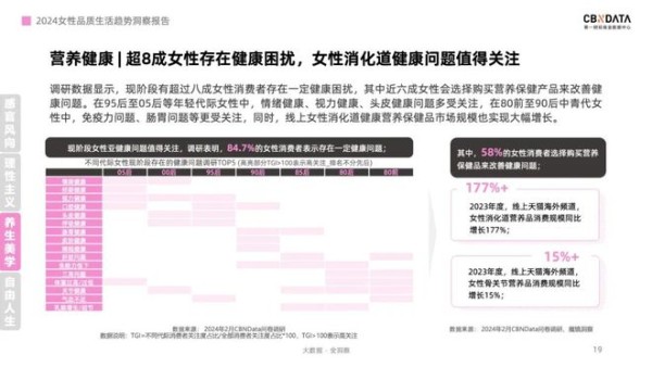 为了缓解这些健康困扰,女性消费者采取了多种措施。近六成女性选择购买营养保健产品来改善健康状况,营养保健品市场呈现出强劲的增长势头。例如,2023年度线上天猫海外频道女性消化道营养品消费规模同比增长了惊人的177%,女性骨关节营养品消费规模也同比增长了15%。这些数字表明,女性消费者对消化道和骨骼健康的关注度正在不断提升。